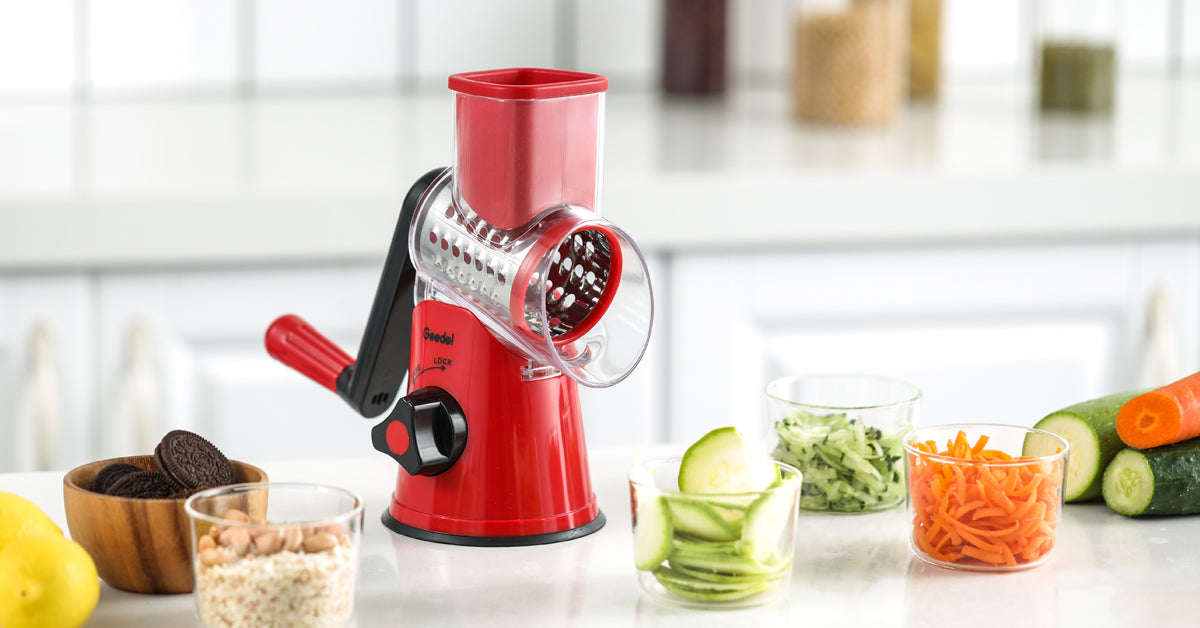 Geedel rotary cheese grater is made of food grade BPA free material. 3 interchangeable blades make slicing, shredding and grinding easier. The unique rotating drum cutting design makes the drum grater cut the ingredients 12x faster than other box graters. Features: Ensure Food safety- Non-toxic & BPA free 3 interchangeable blades- Making slicing, shredding and grinding easier Detachable...